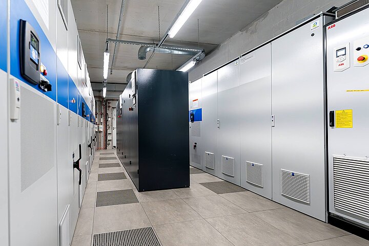 Im Fernwärmegebäude installierten wir die komplette Lüftungs- und Kältetechnik. Hier befinden sich die sensiblen Schaltanlagen – Frequenzumrichter- und Batterieräume, in denen die Umgebungstemperatur präzise geregelt werden muss, um die Betriebssicherheit der elektrischen Anlagen zu gewährleisten.