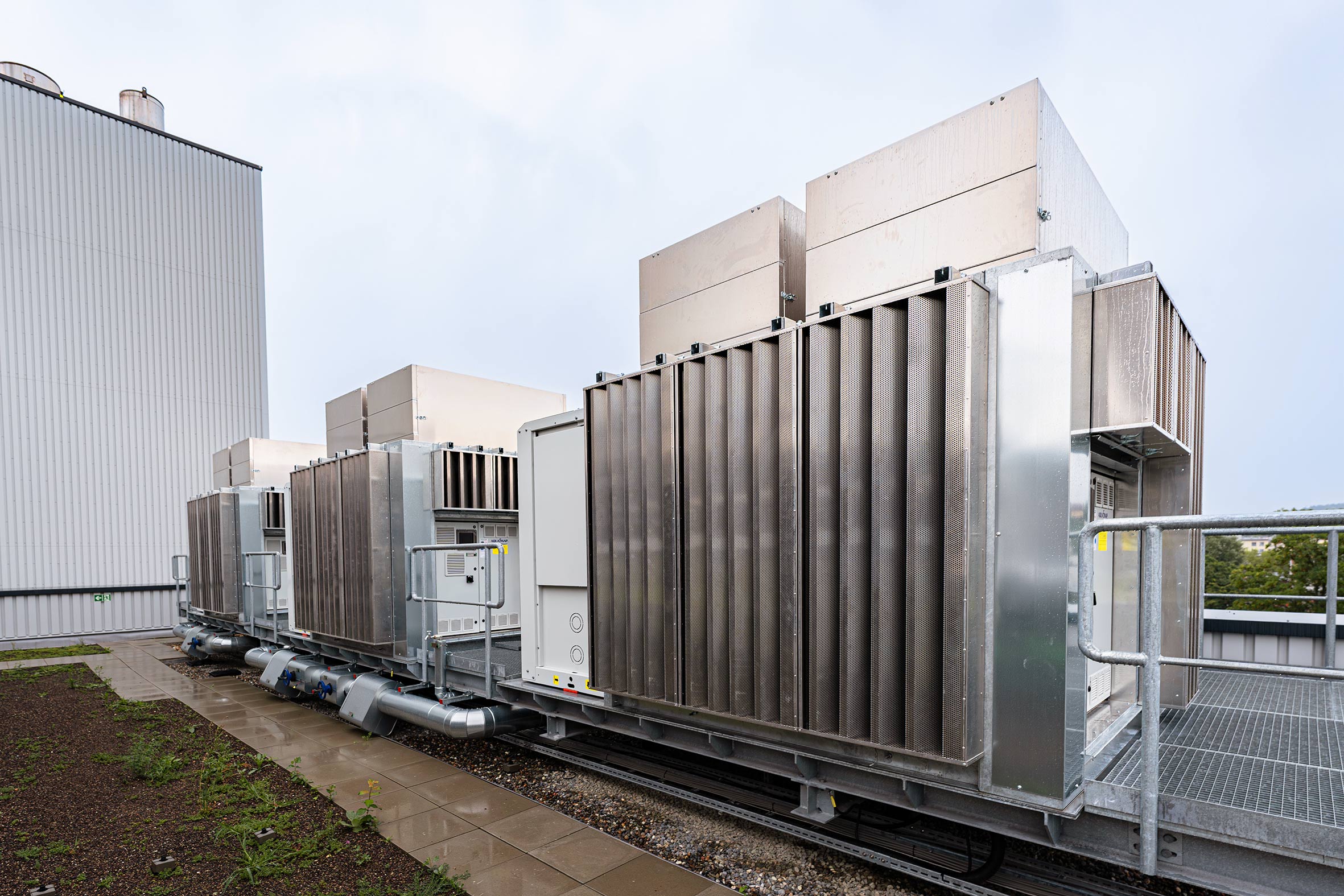 Herzstück der Kälteversorgung sind drei Carrier-Kältemaschinen mit jeweils 216 kW Leistung, die auf dem Dach des Gebäudes installiert sind. Die erzeugte Kälte wird ausschließlich für diese empfindlichen Räume verwendet. Ohne Kühlung würden hier Temperaturen von bis zu 50 °C entstehen. Mit der neuen Anlage bleibt die Raumtemperatur konstant bei etwa 23 °C.