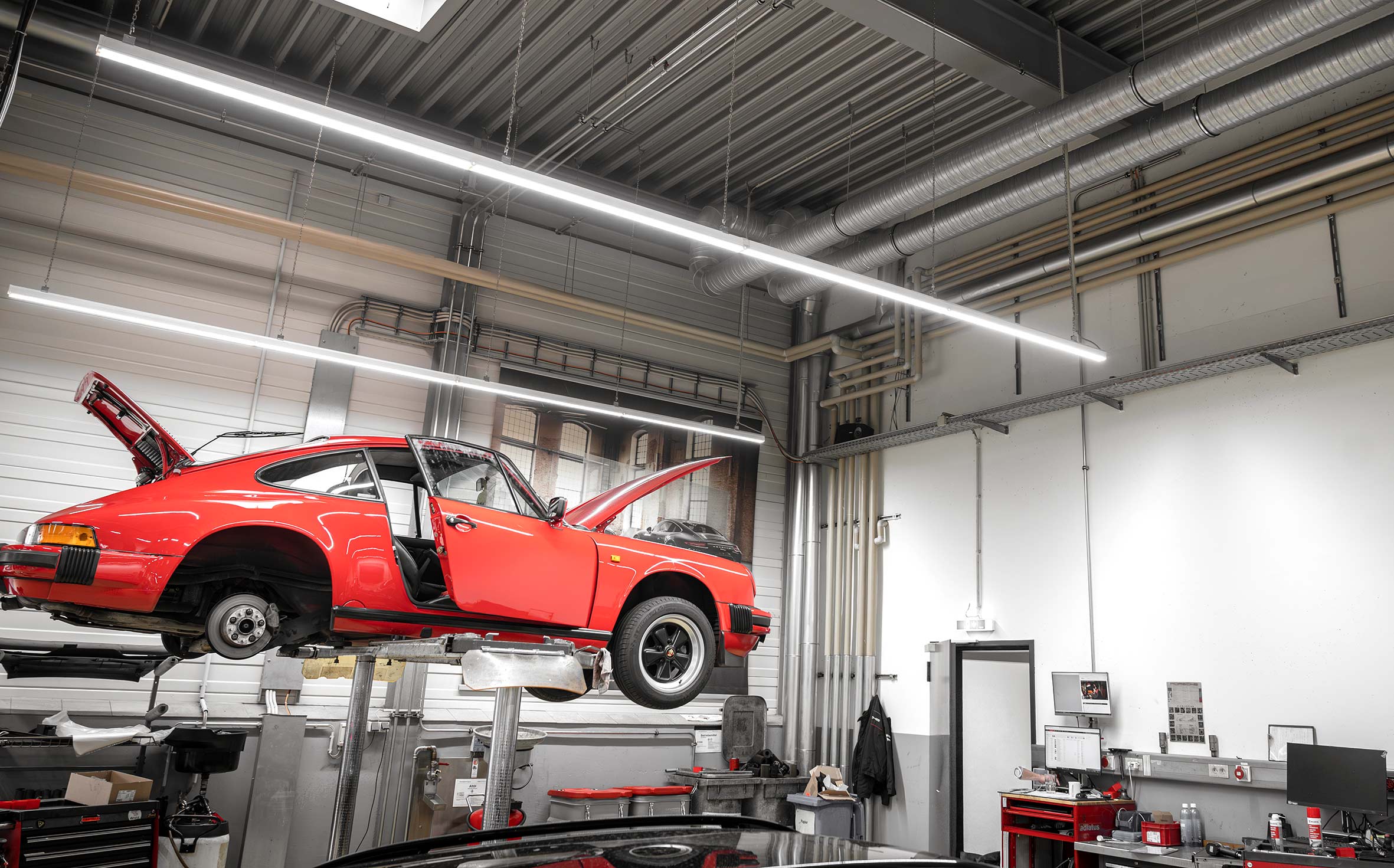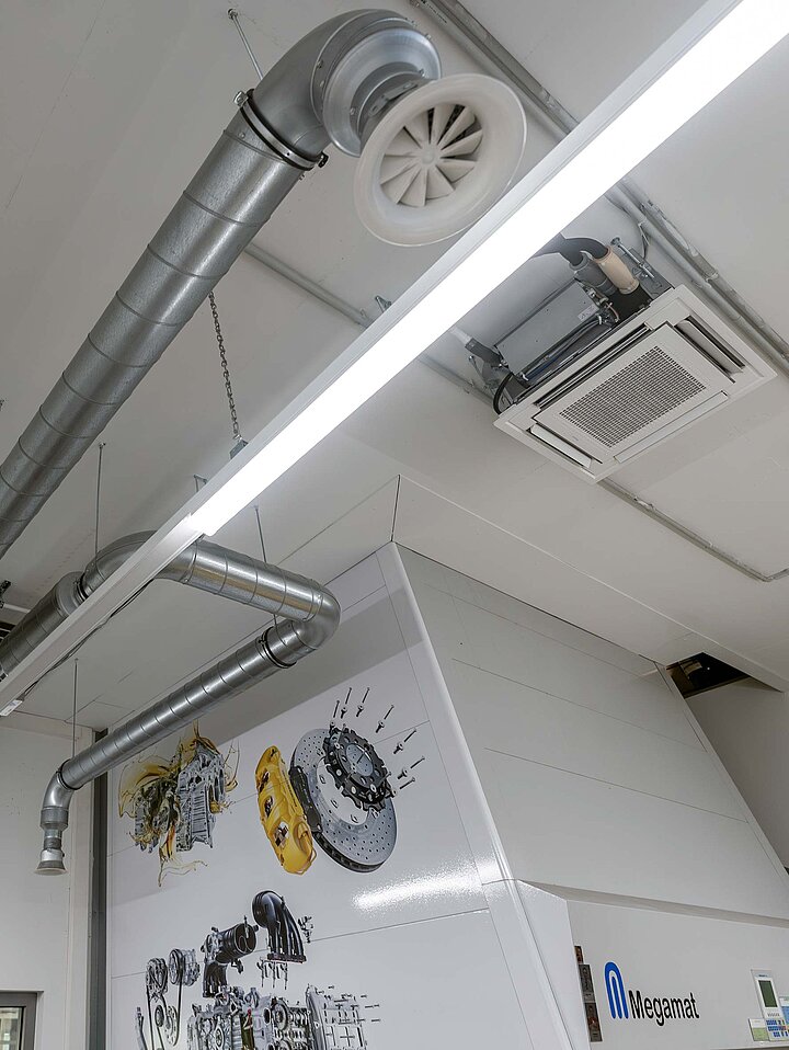 Eine besondere Herausforderung war die Ausführung im Sichtbereich des Showrooms. Dort musste jedes Bauteil nicht nur technisch perfekt, sondern auch optisch makellos installiert werden. Wir legten größten Wert auf präzise Montage, saubere Linienführung und eine harmonische Integration in das architektonische Gesamtbild. Das Ergebnis kann sich sehen lassen: Eine technisch ausgereifte und ästhetisch ansprechende Lüftungslösung, die das edle Ambiente des Porsche Zentrums unterstreicht.