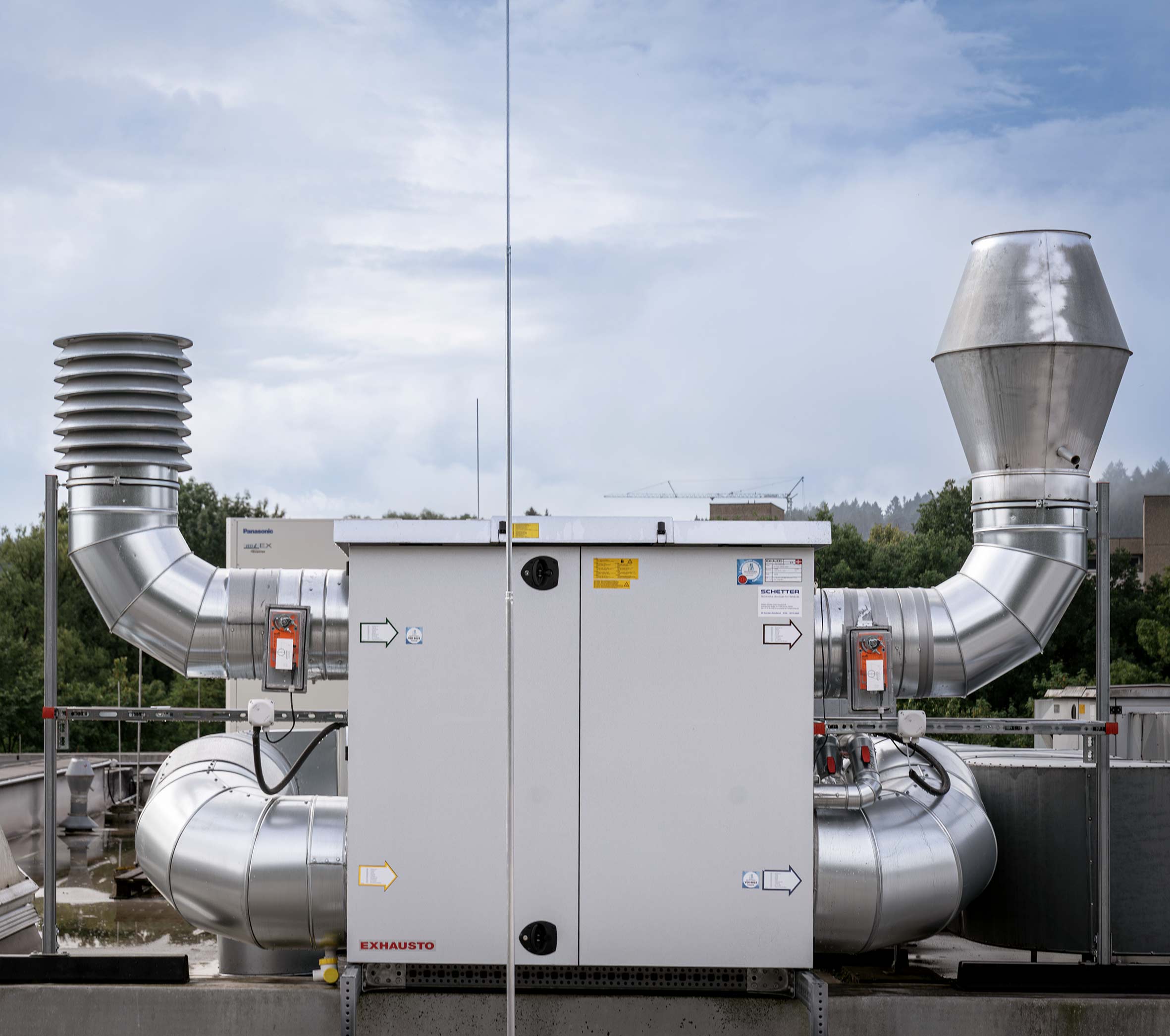 Wir installierten eine neue Lüftungsanlage mit einem Volumenstrom von rund 1.600 m³/h. Das System ermöglicht eine effiziente Be- und Entlüftung sowie eine bedarfsgerechte Beheizung der Räume. Herzstück der Anlage ist ein moderner Kreuzstrom-Wärmetauscher, der energetisch überzeugt und den neuesten technischen Standards entspricht. Ergänzt wurde das System durch Brandschutzklappen und eine intelligente Leitungsführung, die größtmögliche Sicherheit und Effizienz gewährleistet. Alle Komponenten der Lüftungsanlage befinden sich auf dem Dach. Das ist eine platzsparende und wartungsfreundliche Lösung, die dem modernen Gebäudekonzept entspricht.